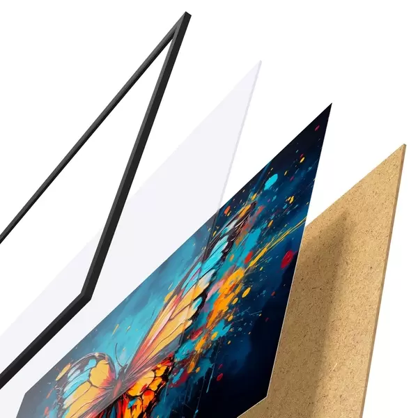 El póster consta de marco, plexiglás, imagen impresa y soporte de aglomerado. El póster puede colgarse inmediatamente en la pared gracias a los soportes de la parte posterior.