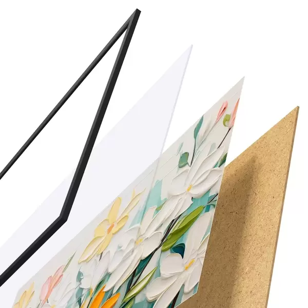 El póster consta de marco, plexiglás, imagen impresa y soporte de aglomerado. El póster puede colgarse inmediatamente en la pared gracias a los soportes de la parte posterior.