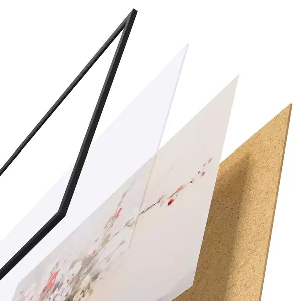 El póster consta de marco, plexiglás, imagen impresa y soporte de aglomerado. El póster puede colgarse inmediatamente en la pared gracias a los soportes de la parte posterior.
