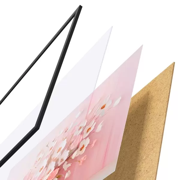 El póster consta de marco, plexiglás, imagen impresa y soporte de aglomerado. El póster puede colgarse inmediatamente en la pared gracias a los soportes de la parte posterior.