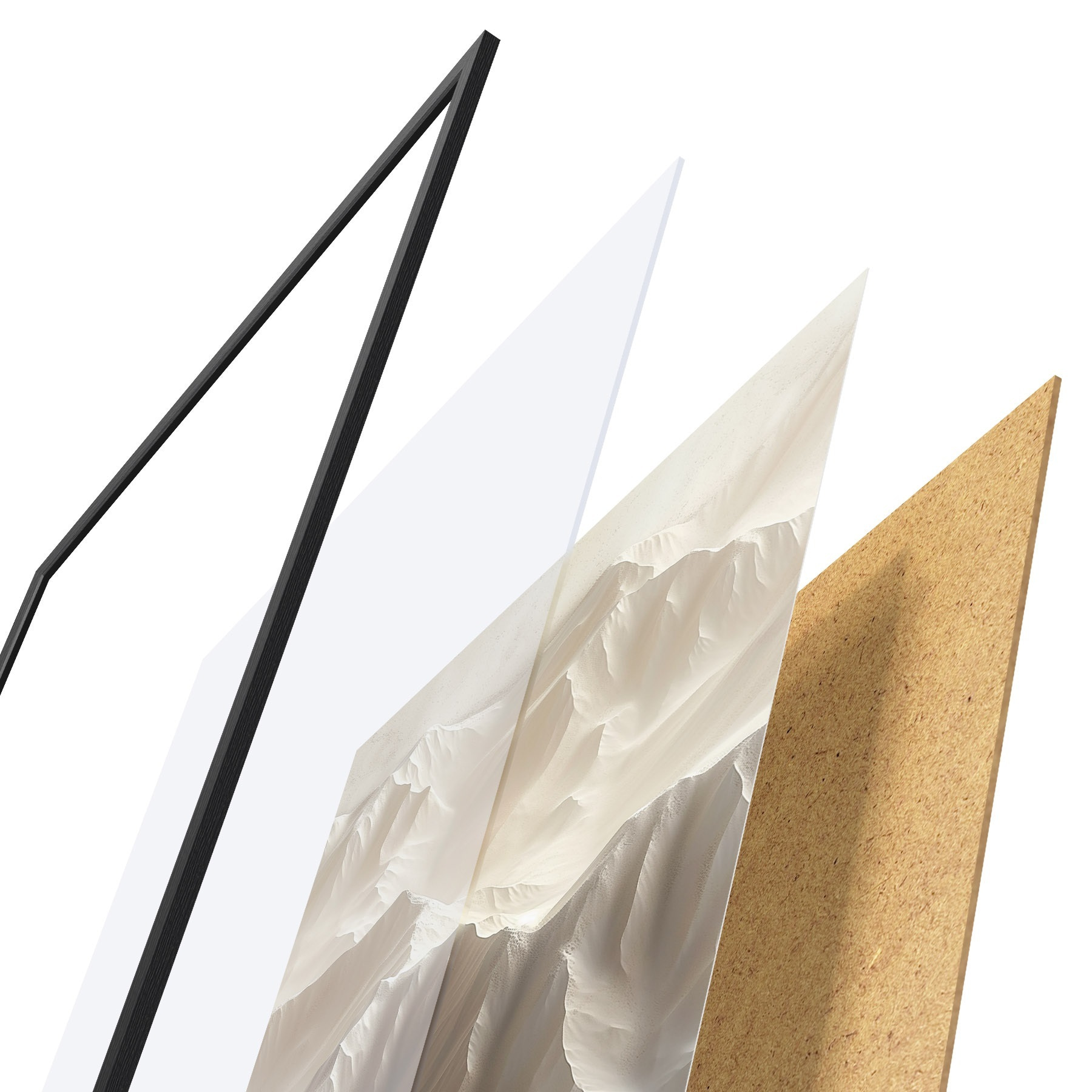El póster consta de marco, plexiglás, imagen impresa y soporte de aglomerado. El póster puede colgarse inmediatamente en la pared gracias a los soportes de la parte posterior.