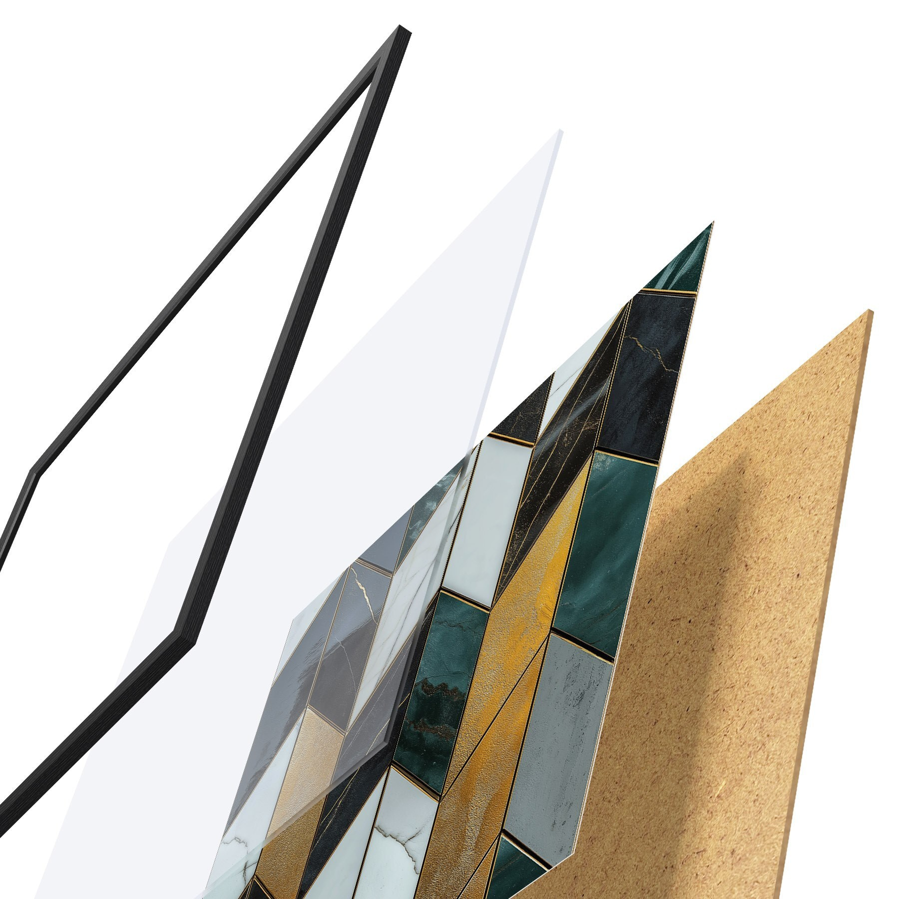 El póster consta de marco, plexiglás, imagen impresa y soporte de aglomerado. El póster puede colgarse inmediatamente en la pared gracias a los soportes de la parte posterior.