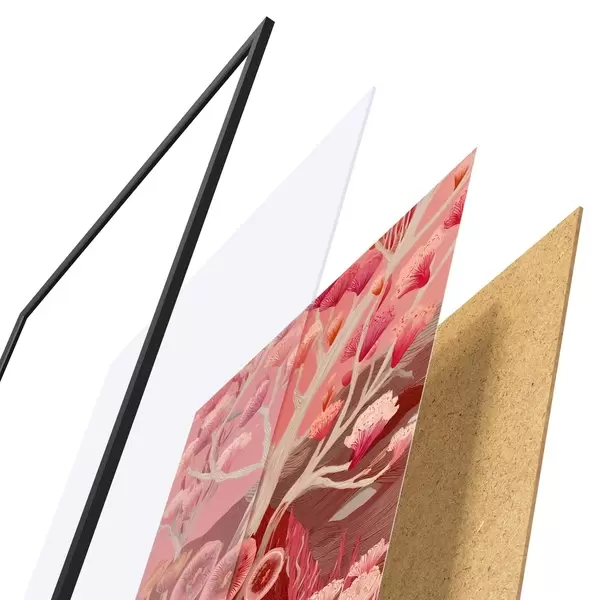 El póster consta de marco, plexiglás, imagen impresa y soporte de aglomerado. El póster puede colgarse inmediatamente en la pared gracias a los soportes de la parte posterior.