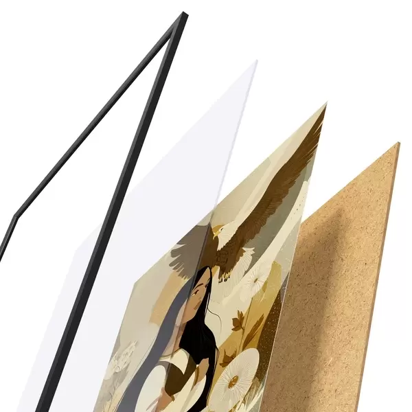 El póster consta de marco, plexiglás, imagen impresa y soporte de aglomerado. El póster puede colgarse inmediatamente en la pared gracias a los soportes de la parte posterior.