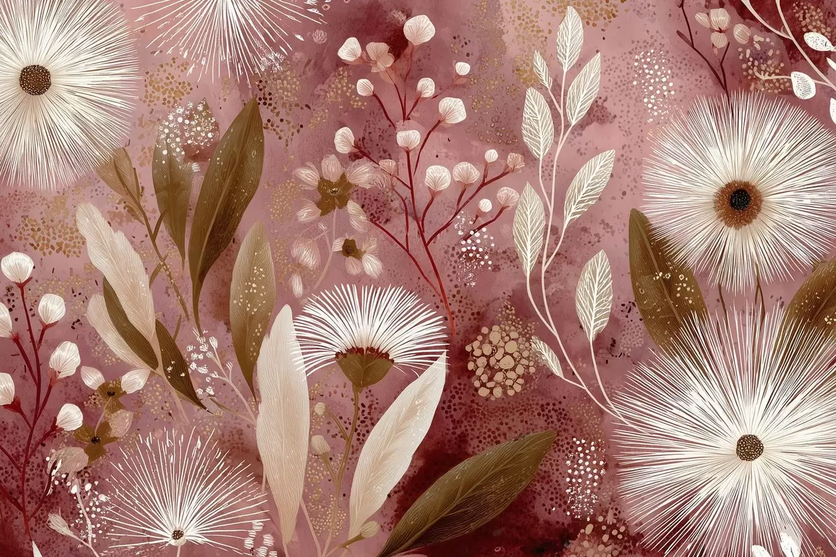 Poster Flores blancas de estilo boho sobre fondo rojo, dibujo detallado Nr f44979
