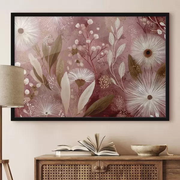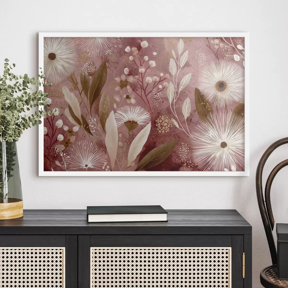 Poster Flores blancas de estilo boho sobre fondo rojo, dibujo detallado f44979