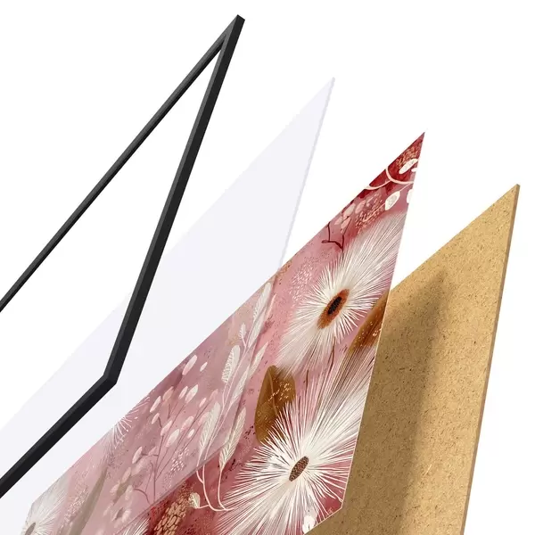 El póster consta de marco, plexiglás, imagen impresa y soporte de aglomerado. El póster puede colgarse inmediatamente en la pared gracias a los soportes de la parte posterior.