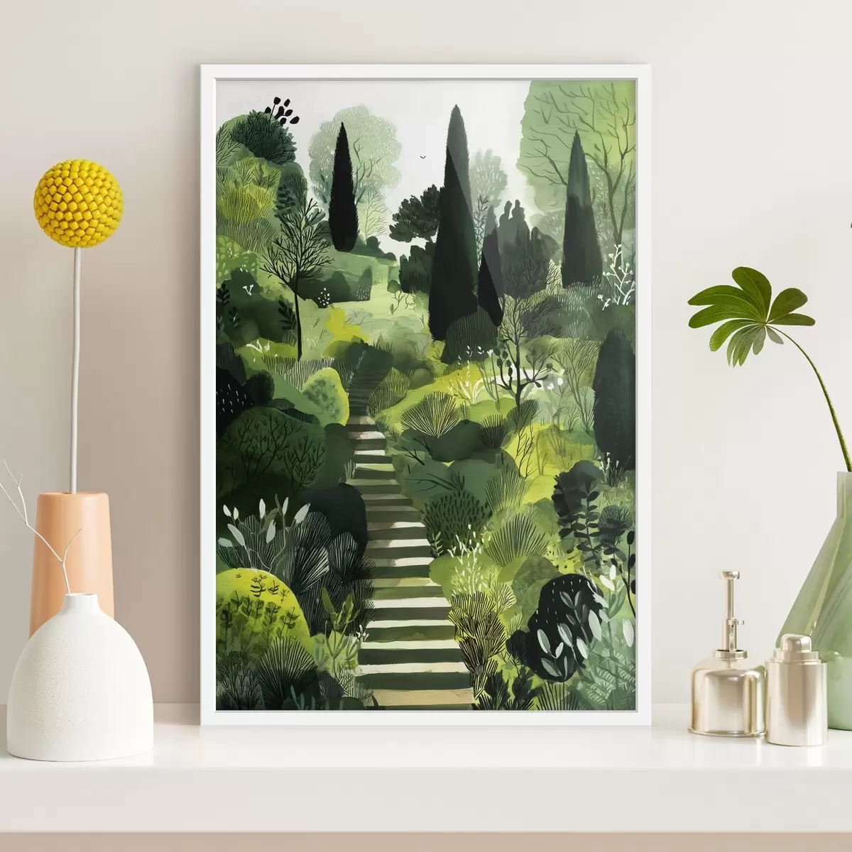 Poster Colinas verdes con árboles y arbustos, escaleras de hormigón, colores exuberantes f44980