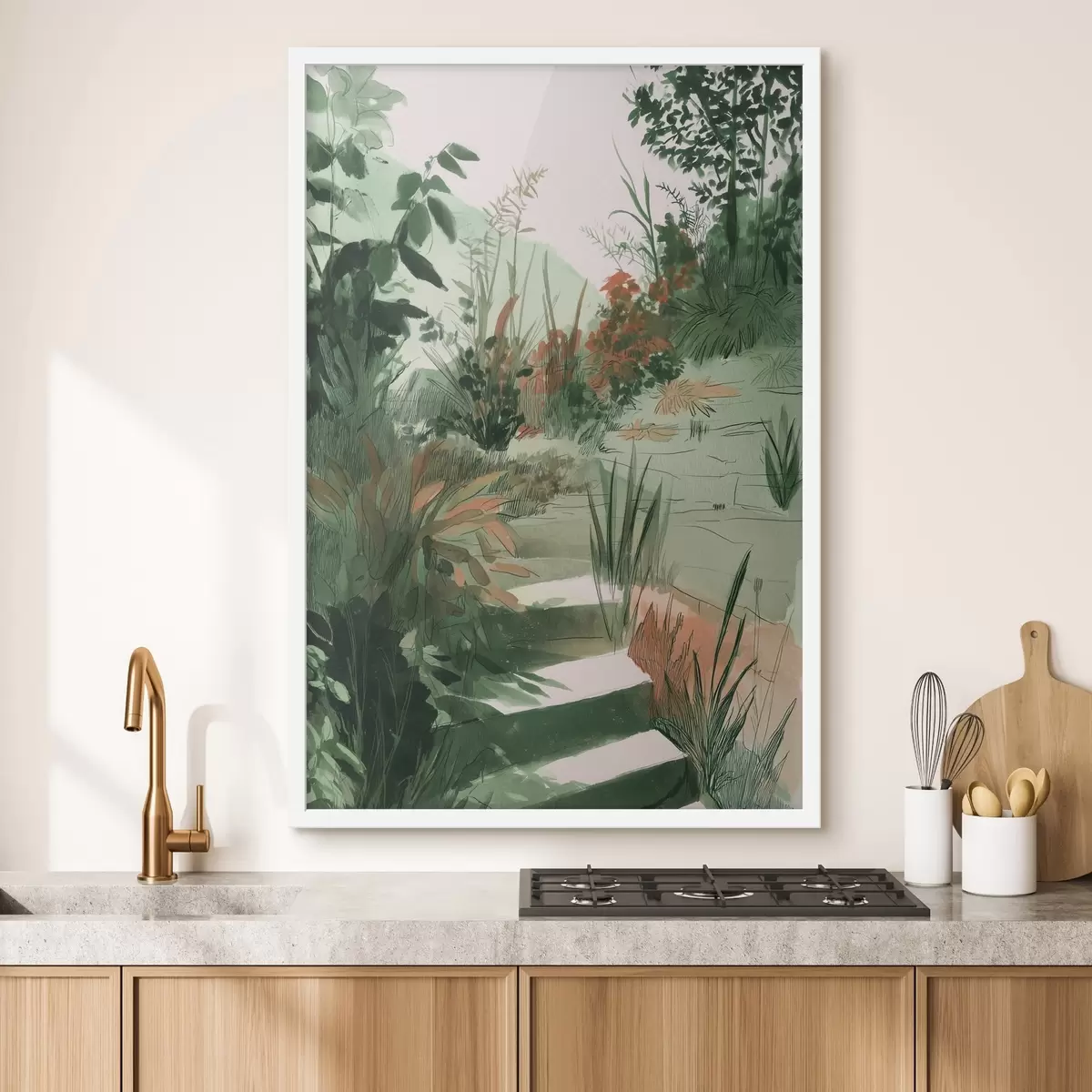 Poster Jardín oriental con arbustos y árboles, colores verdes Nr f44982