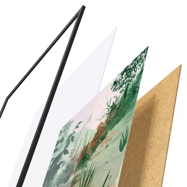 El póster consta de marco, plexiglás, imagen impresa y soporte de aglomerado. El póster puede colgarse inmediatamente en la pared gracias a los soportes de la parte posterior.
