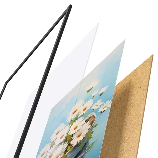 El póster consta de marco, plexiglás, imagen impresa y soporte de aglomerado. El póster puede colgarse inmediatamente en la pared gracias a los soportes de la parte posterior.