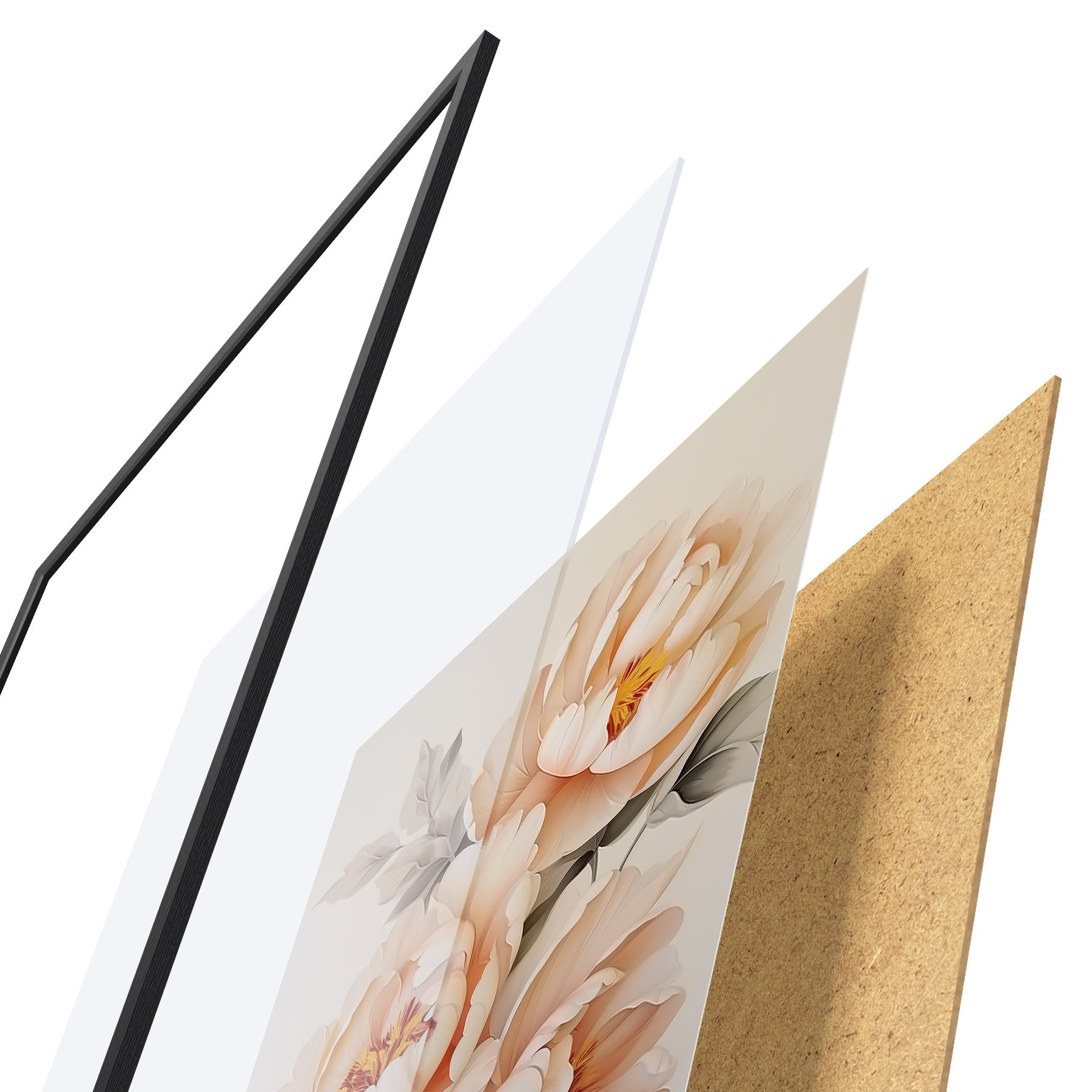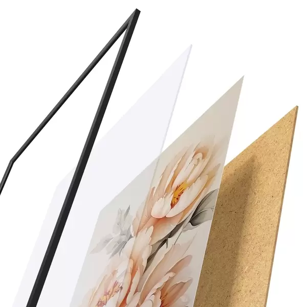 El póster consta de marco, plexiglás, imagen impresa y soporte de aglomerado. El póster puede colgarse inmediatamente en la pared gracias a los soportes de la parte posterior.