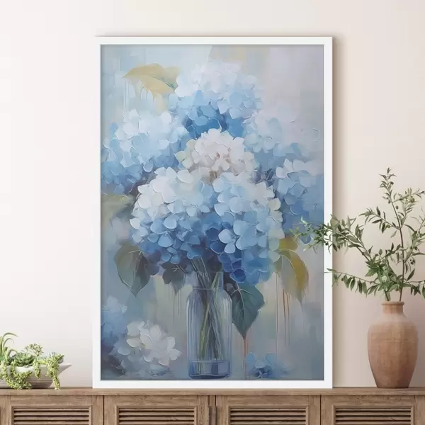 Poster Ramo de hortensias azules en jarrón de cristal f44998
