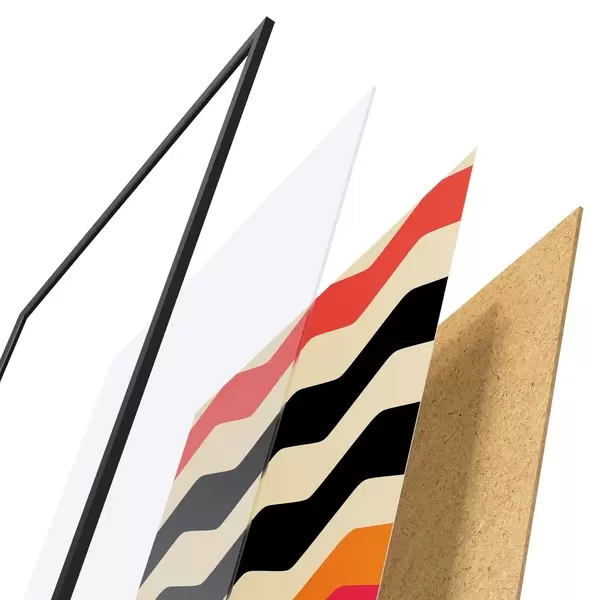 El póster consta de marco, plexiglás, imagen impresa y soporte de aglomerado. El póster puede colgarse inmediatamente en la pared gracias a los soportes de la parte posterior.