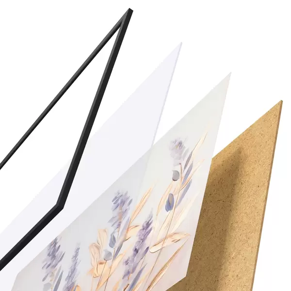El póster consta de marco, plexiglás, imagen impresa y soporte de aglomerado. El póster puede colgarse inmediatamente en la pared gracias a los soportes de la parte posterior.