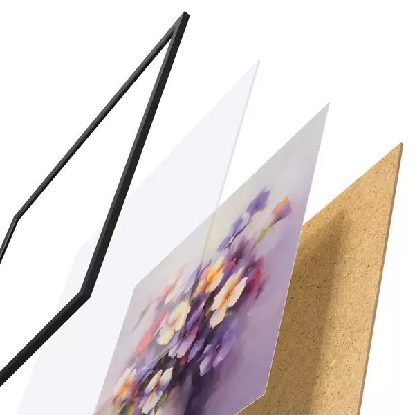 El póster consta de marco, plexiglás, imagen impresa y soporte de aglomerado. El póster puede colgarse inmediatamente en la pared gracias a los soportes de la parte posterior.