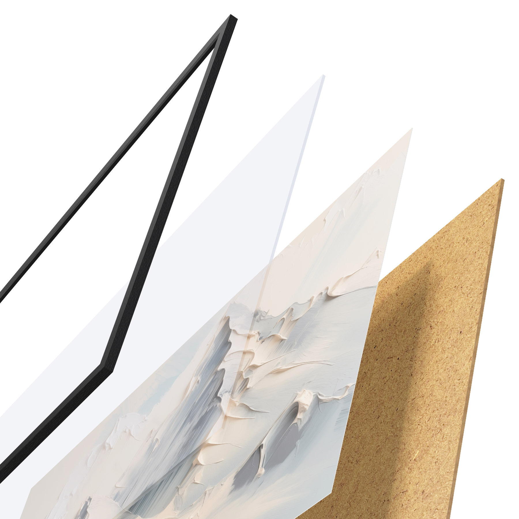 El póster consta de marco, plexiglás, imagen impresa y soporte de aglomerado. El póster puede colgarse inmediatamente en la pared gracias a los soportes de la parte posterior.