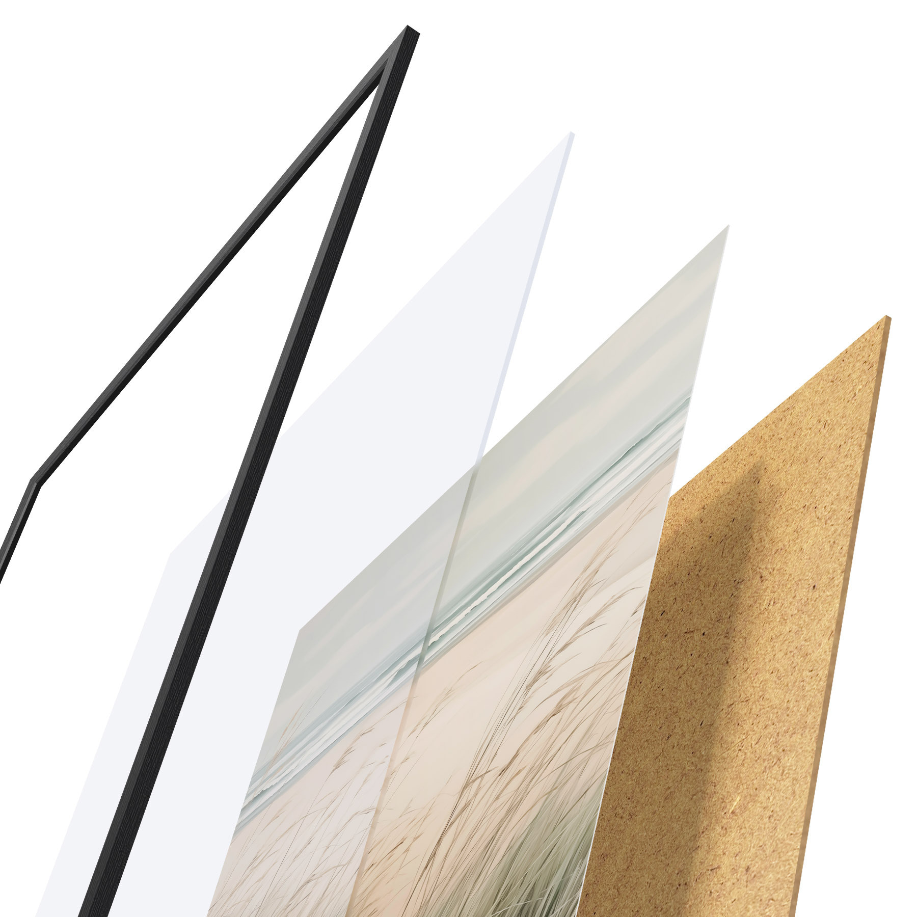 El póster consta de marco, plexiglás, imagen impresa y soporte de aglomerado. El póster puede colgarse inmediatamente en la pared gracias a los soportes de la parte posterior.