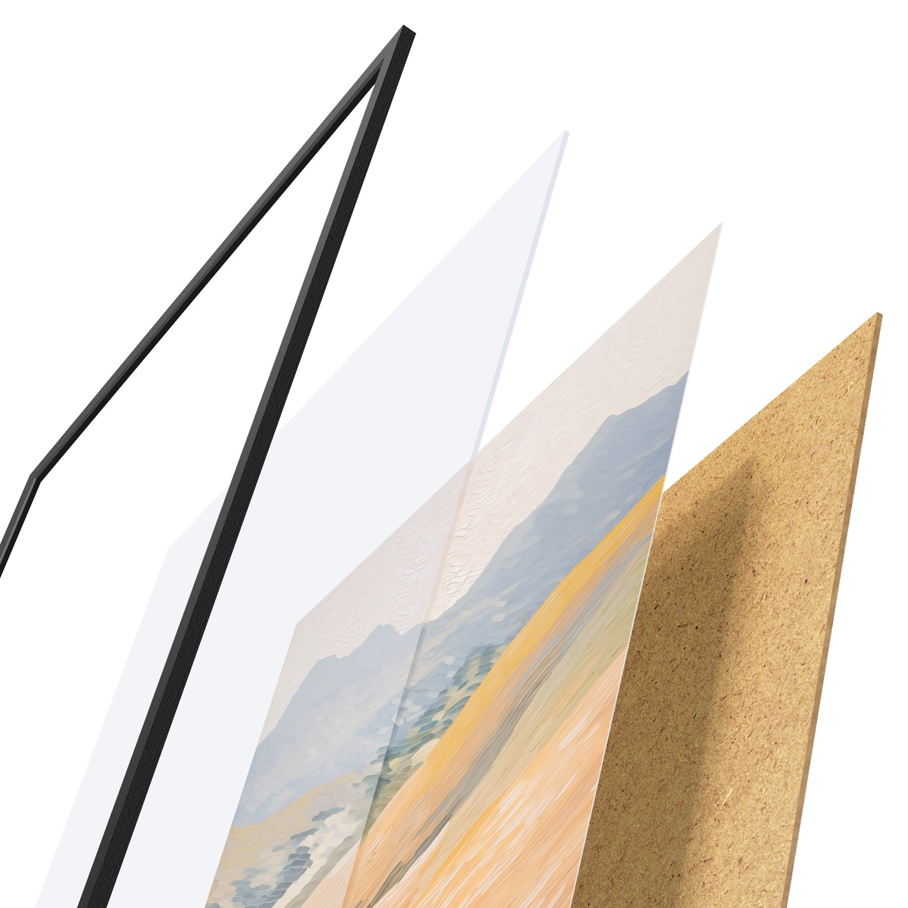 El póster consta de marco, plexiglás, imagen impresa y soporte de aglomerado. El póster puede colgarse inmediatamente en la pared gracias a los soportes de la parte posterior.