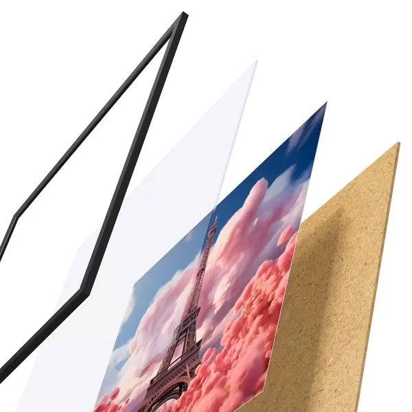 El póster consta de marco, plexiglás, imagen impresa y soporte de aglomerado. El póster puede colgarse inmediatamente en la pared gracias a los soportes de la parte posterior.