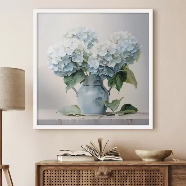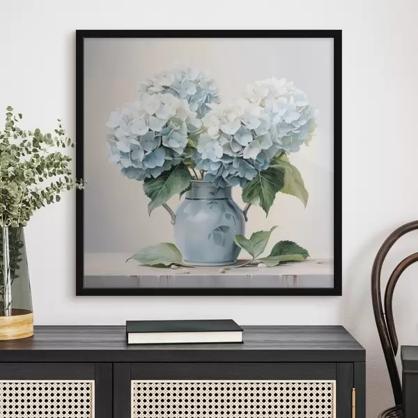 Poster Hortensias frescas en un jarrón azul sobre fondo claro f45043