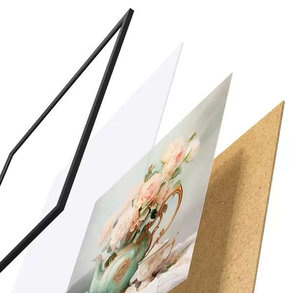 El póster consta de marco, plexiglás, imagen impresa y soporte de aglomerado. El póster puede colgarse inmediatamente en la pared gracias a los soportes de la parte posterior.