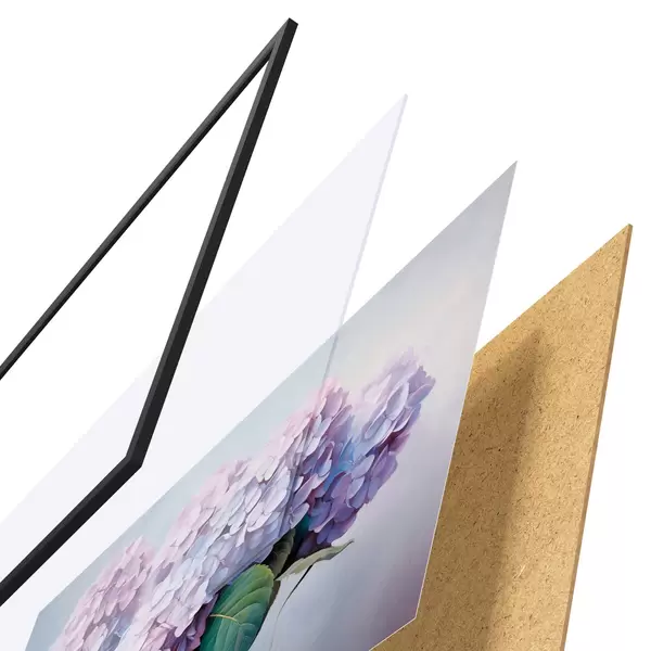 El póster consta de marco, plexiglás, imagen impresa y soporte de aglomerado. El póster puede colgarse inmediatamente en la pared gracias a los soportes de la parte posterior.