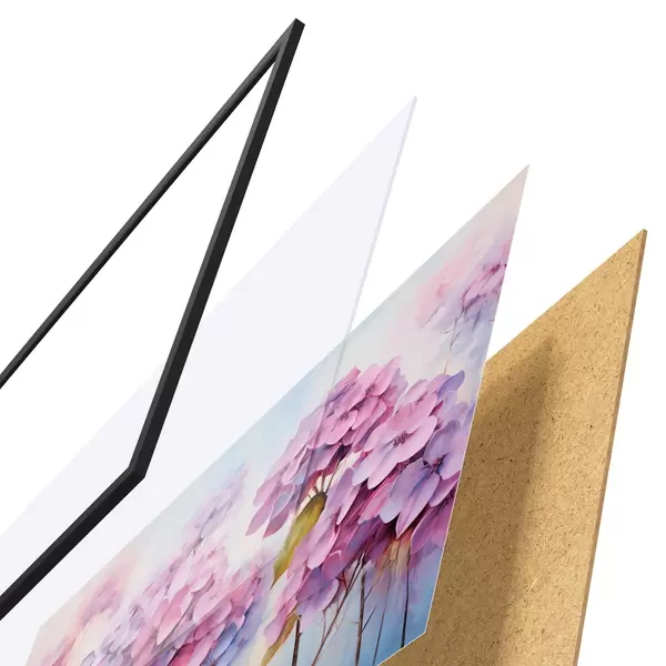 El póster consta de marco, plexiglás, imagen impresa y soporte de aglomerado. El póster puede colgarse inmediatamente en la pared gracias a los soportes de la parte posterior.