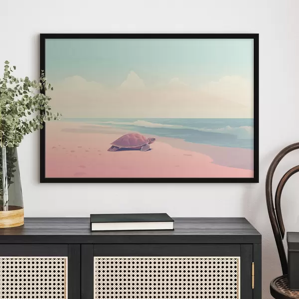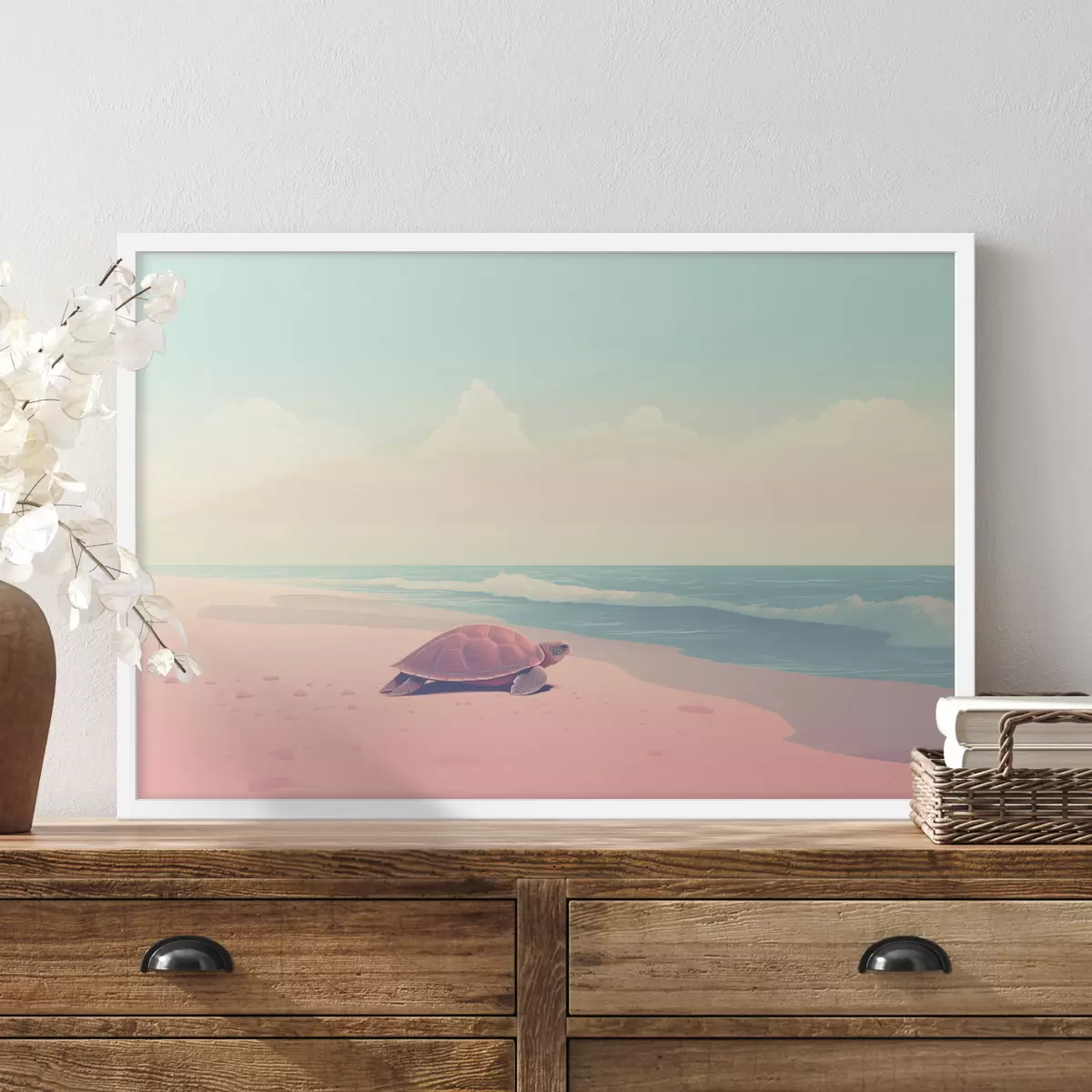 Poster Tortuga marina en una playa rosa: paisaje minimalista f45059