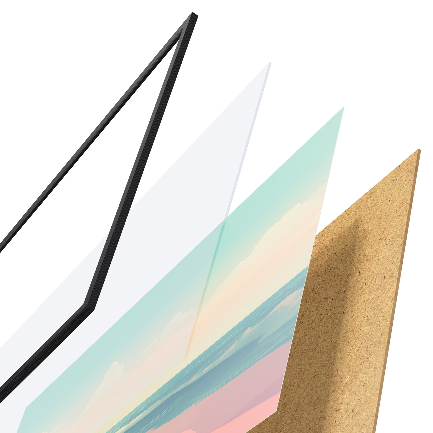 El póster consta de marco, plexiglás, imagen impresa y soporte de aglomerado. El póster puede colgarse inmediatamente en la pared gracias a los soportes de la parte posterior.