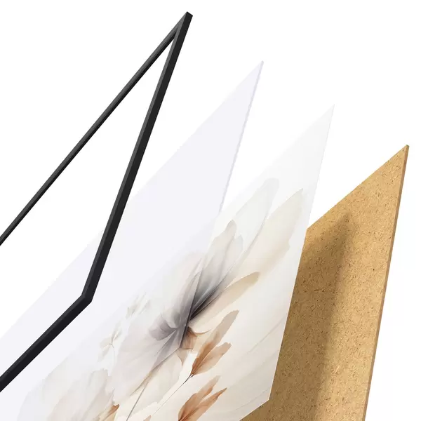 El póster consta de marco, plexiglás, imagen impresa y soporte de aglomerado. El póster puede colgarse inmediatamente en la pared gracias a los soportes de la parte posterior.