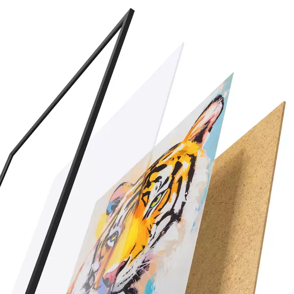 El póster consta de marco, plexiglás, imagen impresa y soporte de aglomerado. El póster puede colgarse inmediatamente en la pared gracias a los soportes de la parte posterior.