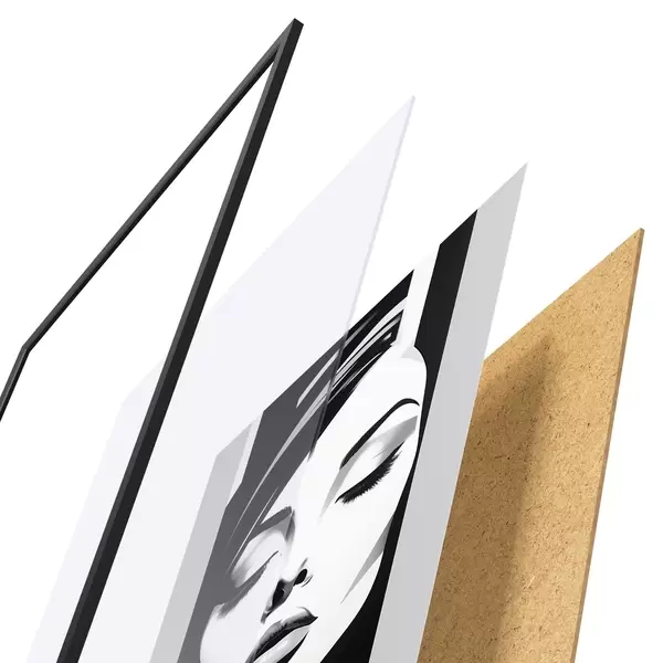 El póster consta de marco, plexiglás, imagen impresa y soporte de aglomerado. El póster puede colgarse inmediatamente en la pared gracias a los soportes de la parte posterior.