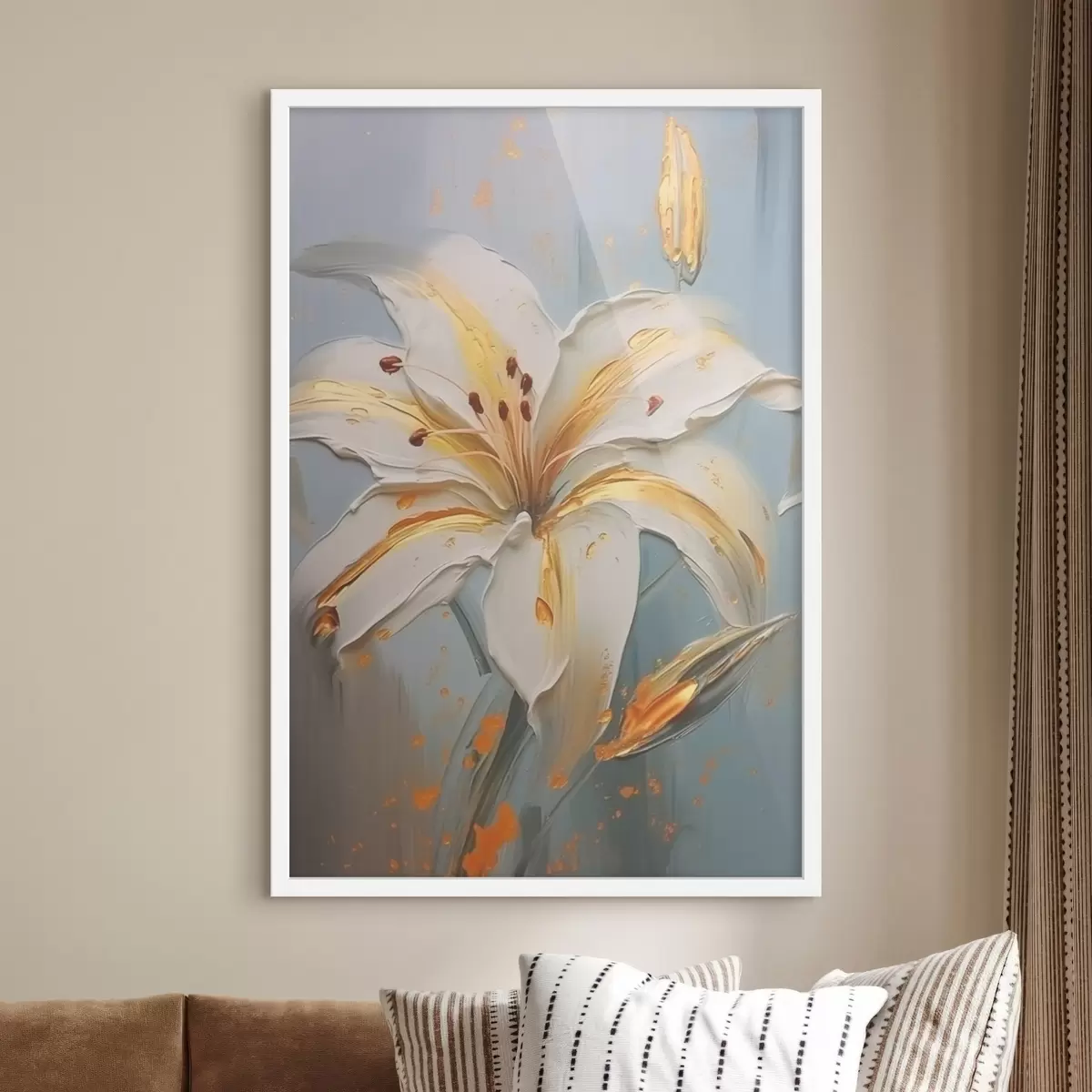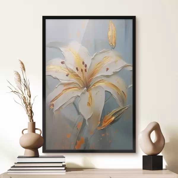 Poster Lirio blanco con trazos amarillos sobre fondo azul f45077