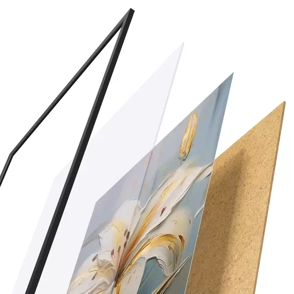 El póster consta de marco, plexiglás, imagen impresa y soporte de aglomerado. El póster puede colgarse inmediatamente en la pared gracias a los soportes de la parte posterior.
