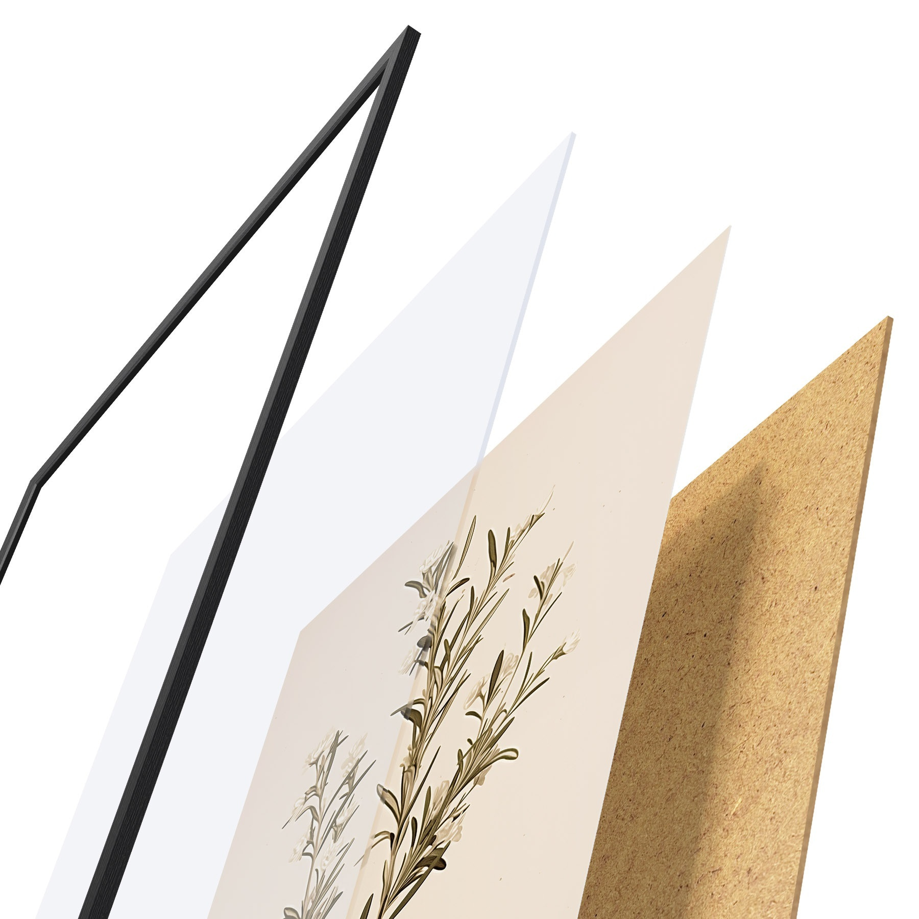 El póster consta de marco, plexiglás, imagen impresa y soporte de aglomerado. El póster puede colgarse inmediatamente en la pared gracias a los soportes de la parte posterior.