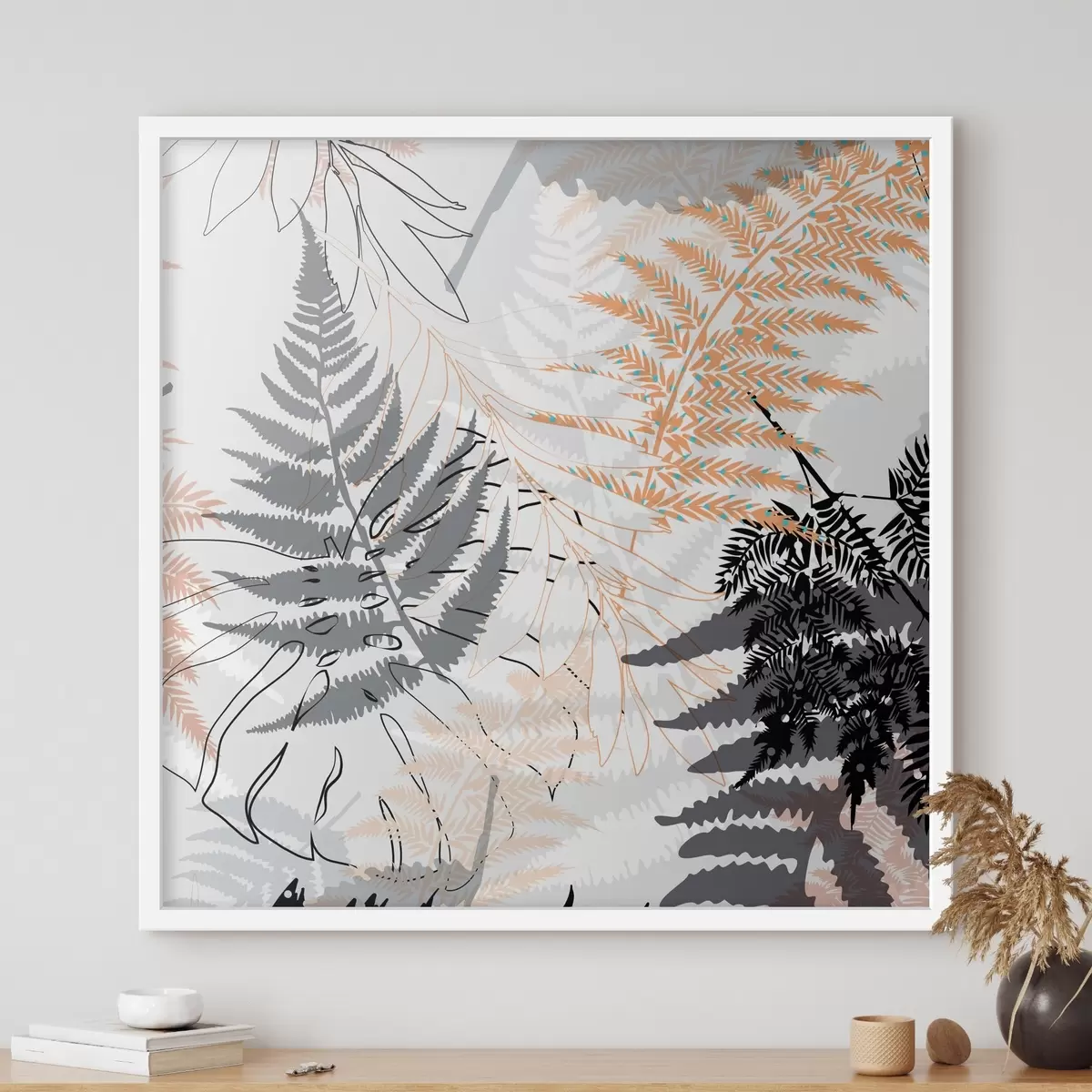 Poster helecho, hojas abstractas, patrón, diseño plano, contraste, tonos grises, botánico, superposición Nr f45101