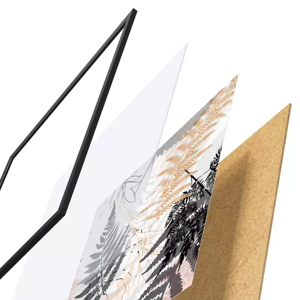 El póster consta de marco, plexiglás, imagen impresa y soporte de aglomerado. El póster puede colgarse inmediatamente en la pared gracias a los soportes de la parte posterior.