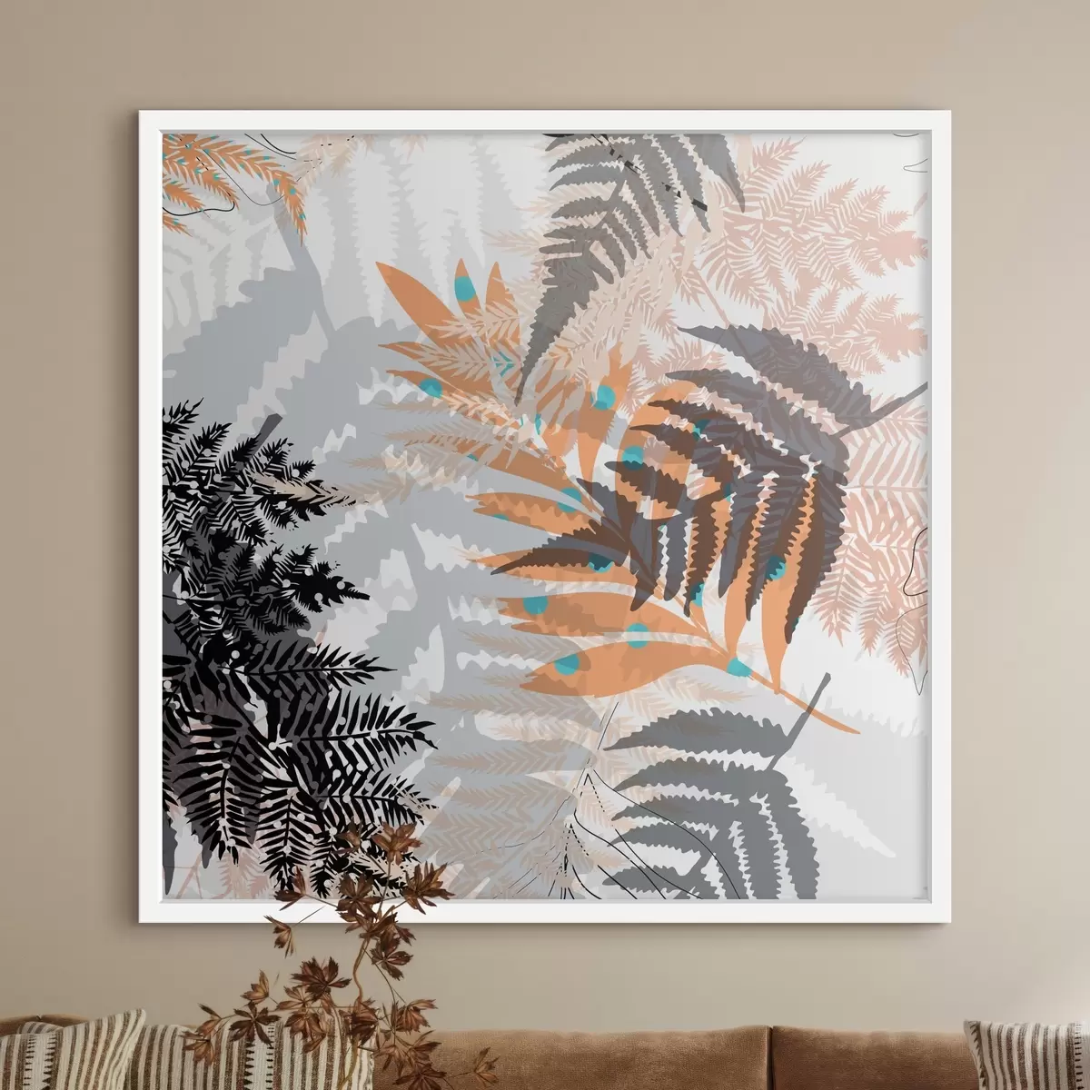 Poster follaje selvático, estilo moderno, arte lineal, plantas en capas, colores apagados, naturaleza Nr f45102