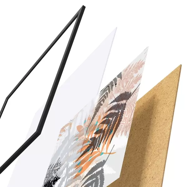 El póster consta de marco, plexiglás, imagen impresa y soporte de aglomerado. El póster puede colgarse inmediatamente en la pared gracias a los soportes de la parte posterior.