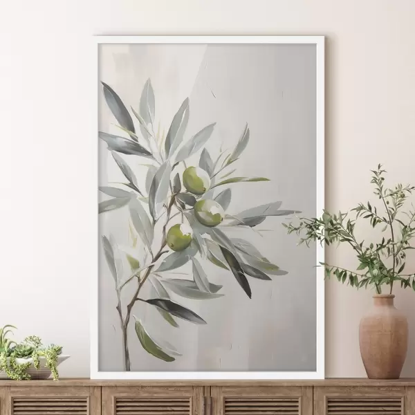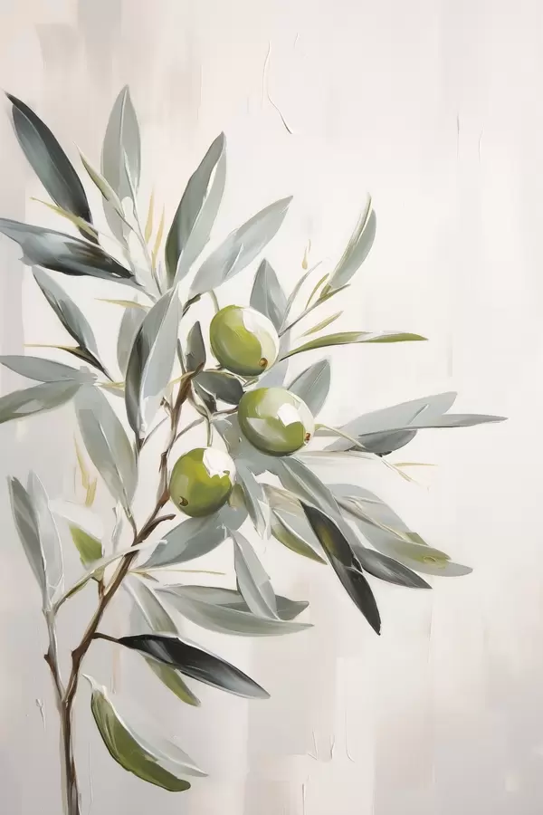Poster rama de olivo, fruto verde, tonos apagados, hojas, minimalista, natural, óleo, botánico Nr f45109