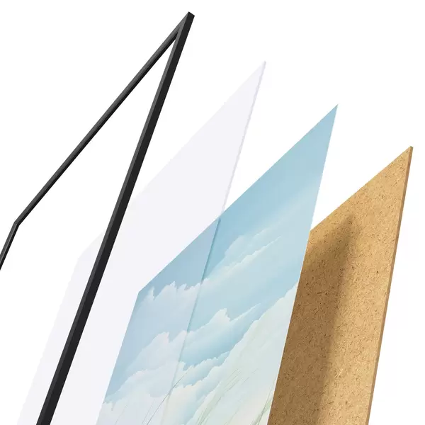 El póster consta de marco, plexiglás, imagen impresa y soporte de aglomerado. El póster puede colgarse inmediatamente en la pared gracias a los soportes de la parte posterior.