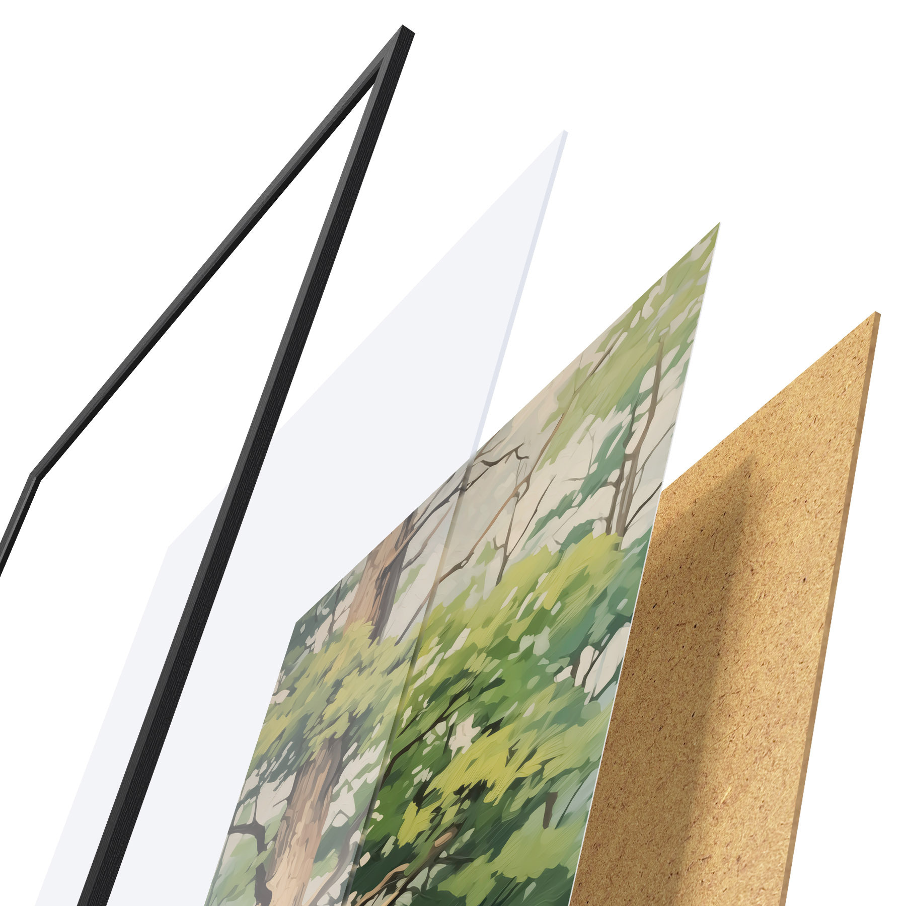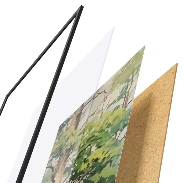 El póster consta de marco, plexiglás, imagen impresa y soporte de aglomerado. El póster puede colgarse inmediatamente en la pared gracias a los soportes de la parte posterior.