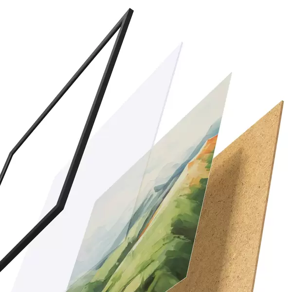 El póster consta de marco, plexiglás, imagen impresa y soporte de aglomerado. El póster puede colgarse inmediatamente en la pared gracias a los soportes de la parte posterior.