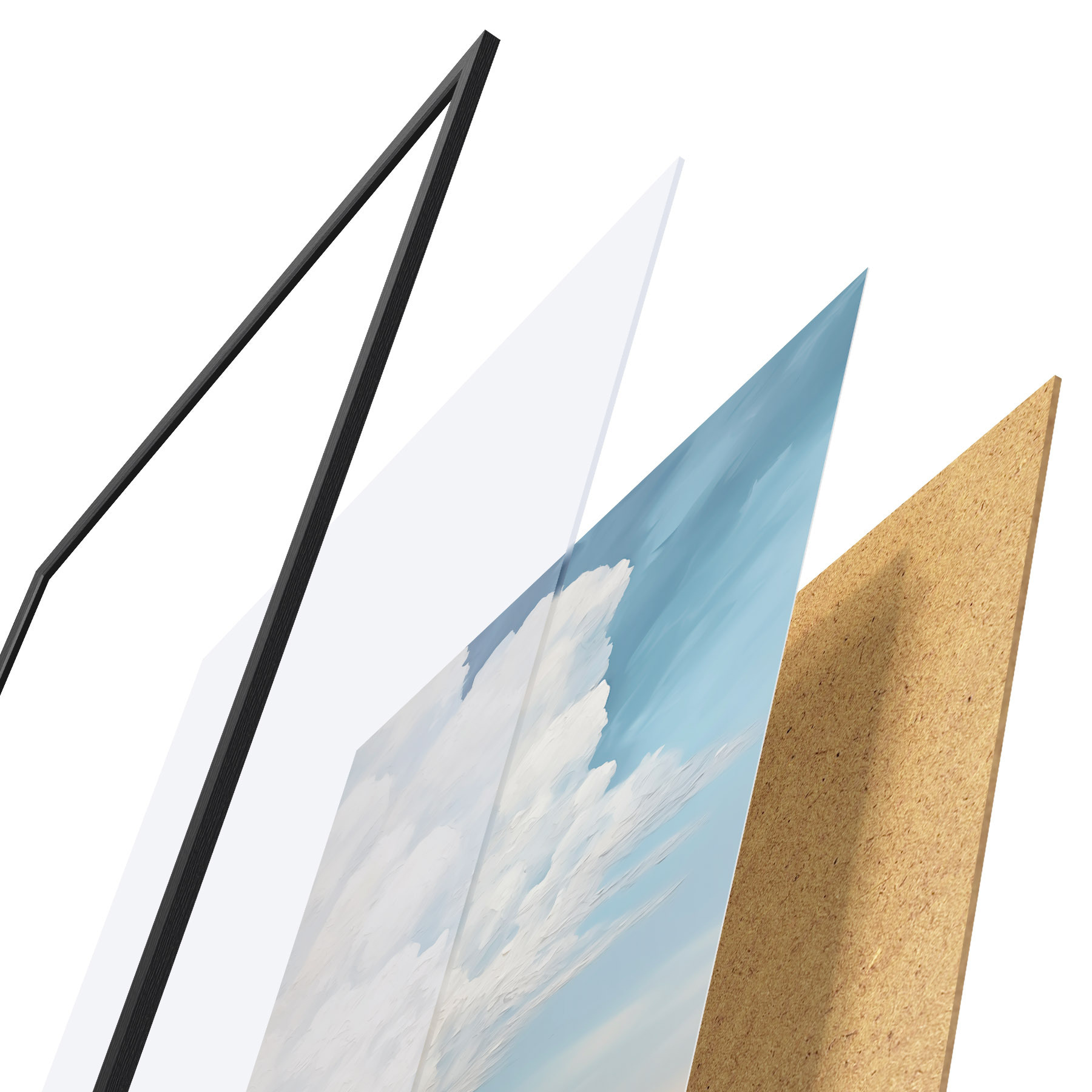El póster consta de marco, plexiglás, imagen impresa y soporte de aglomerado. El póster puede colgarse inmediatamente en la pared gracias a los soportes de la parte posterior.