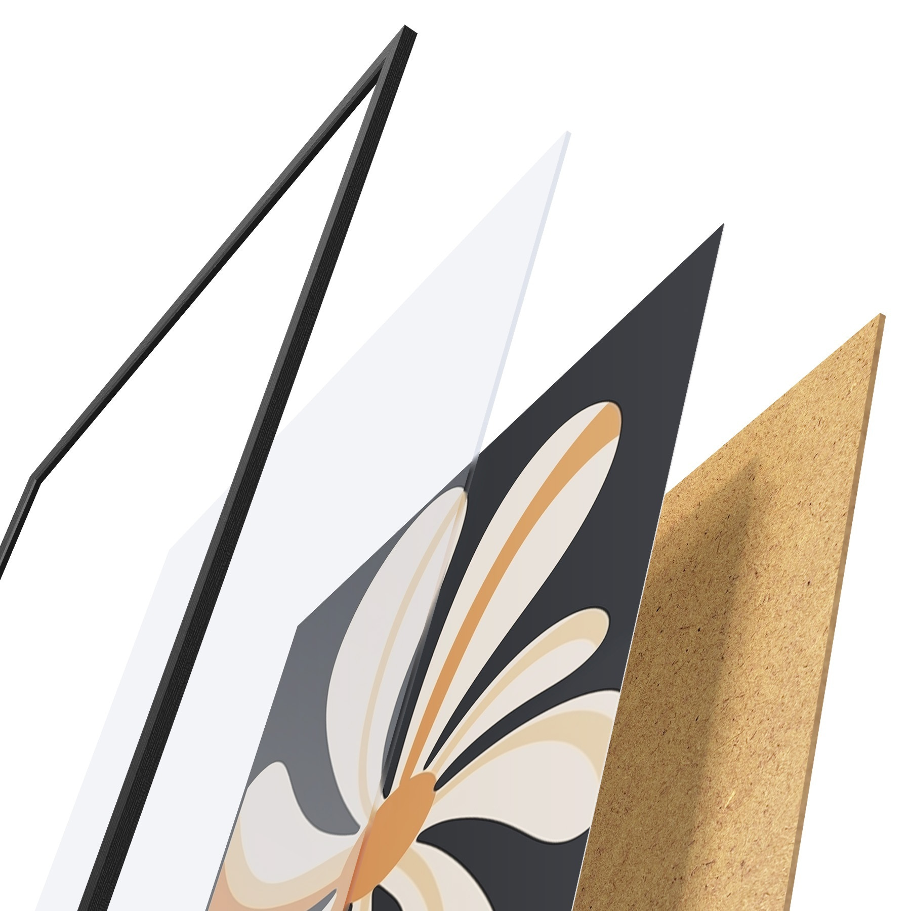 El póster consta de marco, plexiglás, imagen impresa y soporte de aglomerado. El póster puede colgarse inmediatamente en la pared gracias a los soportes de la parte posterior.