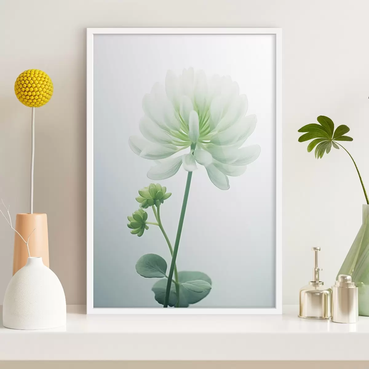 Poster Flor de trébol blanco con tallo y hojas verdes, iluminación suave, fondo limpio, composición minimalista, botánica Nr f45171