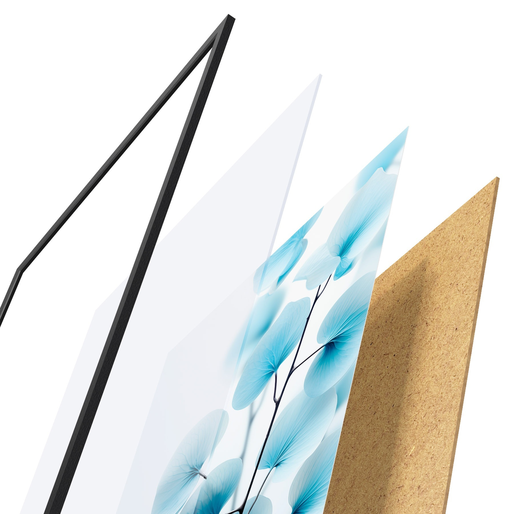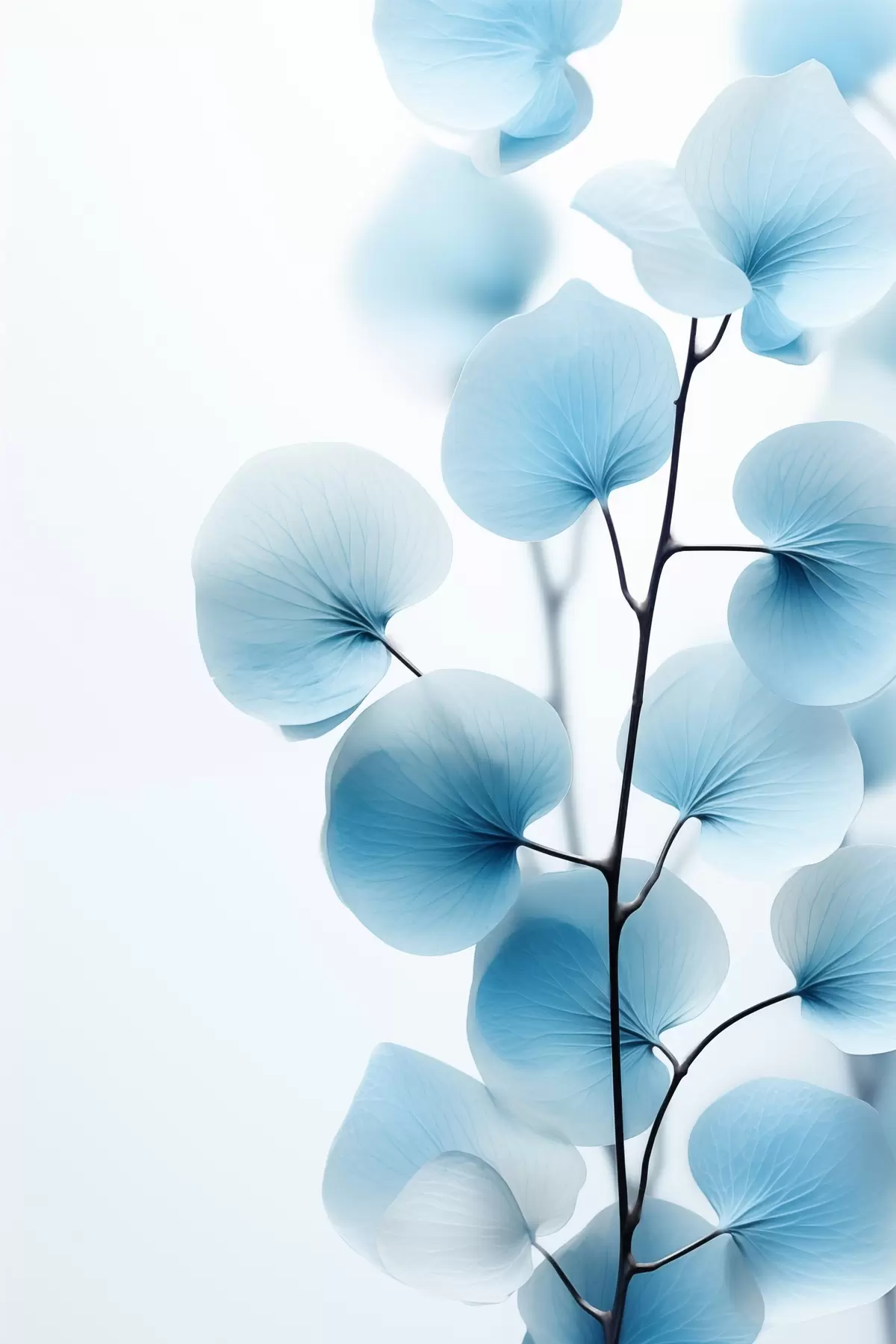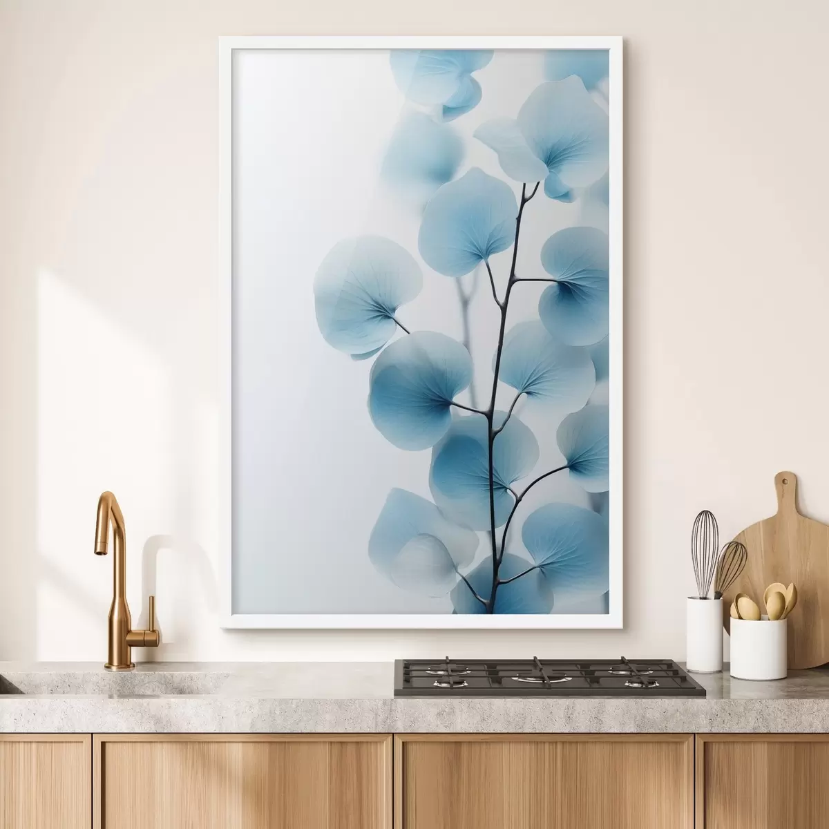 Poster Rama con hojas azul translúcido, delicadas venas visibles, composición ligera y tranquila, estética minimalista Nr f45176