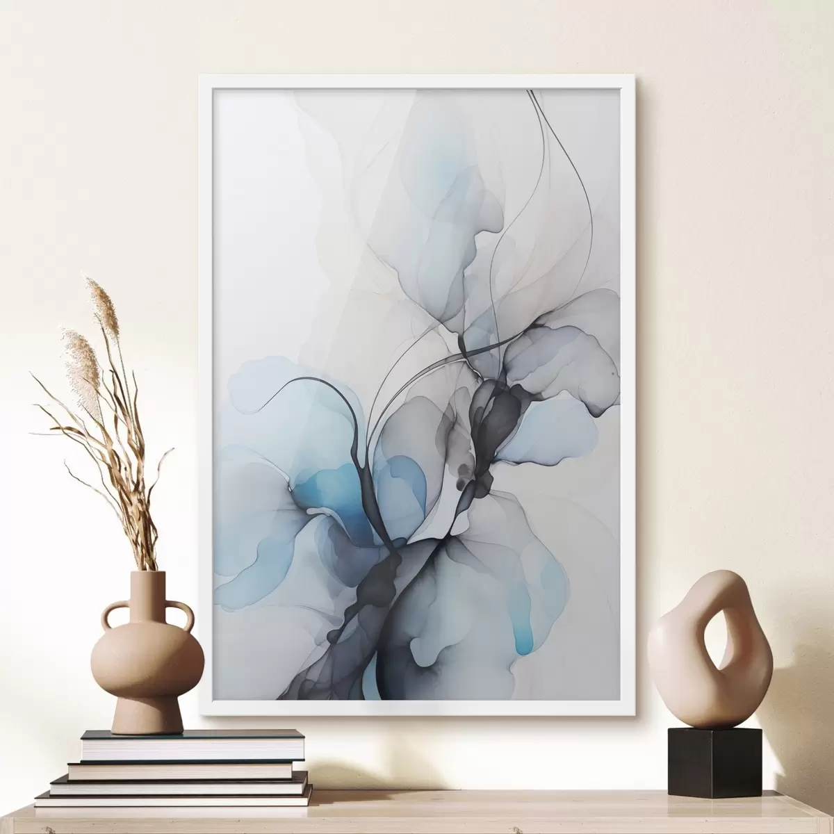 Poster Composición abstracta con líneas fluidas y pétalos translúcidos en tonos azul blanco y beige, imitación de tinta de alcohol Nr f45177