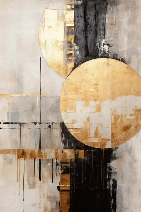 Poster Cuadro abstracto con círculos, líneas negras y amarillas, y un fondo con tonos grises y blancos Nr f45185